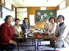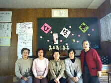 |  | 素晴らしいスカーフが出来あがって本当にうれしいひな祭りになりました。昼食はみんなで持ち寄ったごちそうを頂きました。今日、来れなかった人もいるので、もう一度、スカーフ染をしたいねと言って別れました。(左から北さん、糸永さん、小野さん、西中さん、Mie、山田さん) |