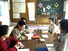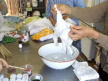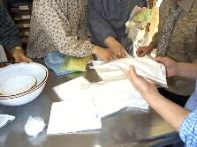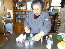 |  | 永年にわたっていろいろな染物を経験なさっている北さんが今日は教えて下さいます。まず、「色粉を溶きますよ、どんな色を作りましょうか?」 |
