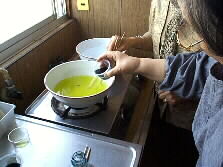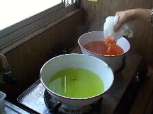 |    熱湯に染料を少しずつ入れながら好みの色にしていきます。「まだ?もう少し濃くしましょうか?水でぬらした生地をつけていきます。よく浸けていいですよ。乾くと淡い色になりますから、その色で良かったら、定着液としてお酢を入れますからね。」と北さんが丁寧に教えて下さいます。 | |