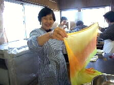 |    「わーー、見て見て!こんなにきれいな色に染まりました。」と好みの色に染まってうれしい山田さんです。タオルにくるんで水気を取ってからアイロンをかけて仕上げをしていきます。 | |