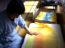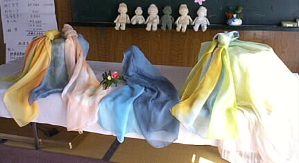 |  | 白い絹を思い思いの色で染めてスカーフを作ります。絹といっても、サテンのように光ったもの、デシンのようにしぼのあるもの、ジョーゼットが2重になっているものと色々な風合いのものがあります。それぞれ好きな生地を選びました。 |