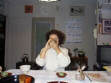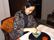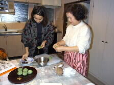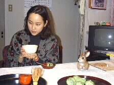 少し、形は不揃いですが、大きな草もちが出来ました。さあ早速、お茶にしましょう。 テーブルの上の可愛いうさぎの人形は、私たちが、Yangさんがホームステイをされた記念にしたいと今日、一緒に買いました。少し寒いと言って着ている私の茶羽織がとても似合っていますね。 |
