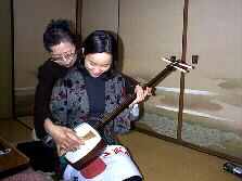 日本の昔から大切にしている暮らしを知りたいというYangさんです。私も折角ホームステイしてもらっているので、出来るだけ日本の良さを知ってもらいたいと思います。ということで、私の友人の力もお借りすることに。 今日は、すぐ近くの私の友人の家に行きました。広いお座敷に床の間と仏壇があります。そういう暮らし振りがとても興味を引いたようです。三味線のお稽古をしている猪原さんは、Yangさんにも大切な三味線を触らせてくれました。音楽が好きで、フルートを吹く彼女にとって冴えた音色は大変興味深い体験だったと思います。 |