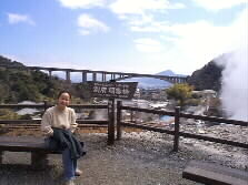 今度は、地面から温泉の蒸気が出ている所を見に行こうと、明礬温泉にきました。別府の町並み、高崎山がとてもきれいに見えました。 |