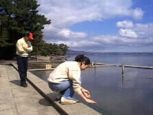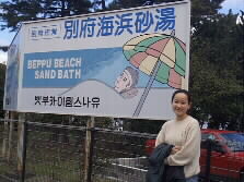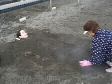 今日は少し寒いけれど、いいお天気になりました。温泉に興味があるというので、別府に行きました。海が大好きといって、海の側にある砂湯が気に入って、入ってみることにしました。 |
