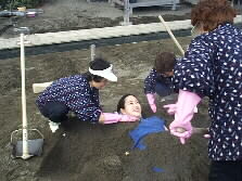 ![]() 浴衣に着替えて、温かい砂の上に横になると、係りの人たちが砂を体にかけて下さいます。重いとかいいながらニコニコしながら目をつぶっています。