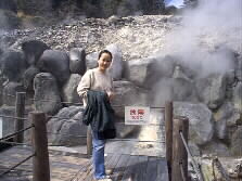 ![]() 明礬の地獄でブクブクと熱湯が吹き上げているのを見て、びっくりしています。そしてその蒸気で蒸した温泉卵をおいしく食べました。