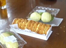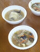 |    自己紹介が始まっていたようですが、おいしそうな団子汁(下)と新作のつみれ汁(左上)が出てきて、「温泉市場」のお話に。右は、ゆきさん差し入れのロールケーキと衛藤さんの奥様の手作り饅頭です。これはいつも市で売ってらっしゃるお饅頭だとか、蓬の香りもあんこもおいしいお饅頭でした。ありがとうございました。 | |
