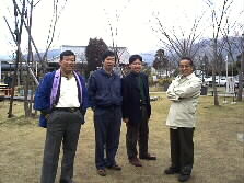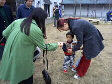 | 辰巳先生を案内なさっていた桑野和泉さんが、とってもいい子だった古庄さんちのゆうちゃんにプレゼント、何とそれは例の赤い靴チョコレート、赤い靴の包みを解くと、本当にチョコレートが出てきました。こちらは男性陣、なかなか去り難くおしゃべりが果てません、でも何だか寒くなってきました。春3月とは言え、まだまだ寒いゆふいんです。今日はこれにて解散としました。    また、ゆふいんへ来られる方がありましたらどうぞメーリングリストに書いて下さいね、「突然オフ会」を致しましょう。 今日は、本当に皆さん、お世話になりました。ありがとうございました。 | |