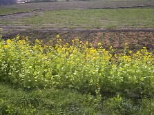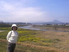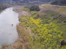 |    我が家から6キロ、1時間30分かかって、ホワイトロードを歩きました。国道10号線に出てから大分川の土手に立ってみました。こちらも河原には菜の花。はるか後ろに見える山は高崎山です。さあ、足がちょっと痛いけれど頑張って歩いて帰りましょう。 | |
