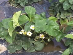 |  | 道路側の畑にはイチゴが植えてありました。こちらも白い花ですね。赤いイチゴはどこ?もう今朝の収穫は終わったようで見当たりません、残念! |