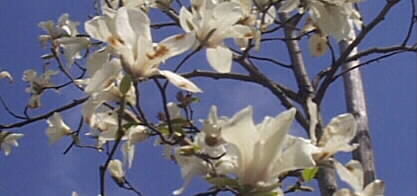 |  見てください、この青い空、本当に久しぶりの青空です。ホワイトロードの歩道の並木は、このハクモクレンです。もう盛りを過ぎてちょっと花びらが弱っています。でも、満開の時はそれはそれはきれいでした。 | |