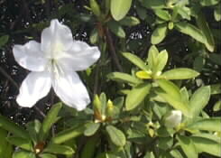 |    もう一つの植え込みはヒラドツツジ、これも勿論真っ白の花が咲くものばかりが植えてありますよ。こちらはもうすぐ満開になる所です。並木のあと1種はサザンカ、大分の市の花であるサザンカの白が植えてあります。まさしくどの季節にも白い花が咲く「ホワイトロード」なのです。 | |