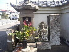 |  | 車がたくさん走っている道路の側にこんなお地蔵様がまつってありました。赤いよだれかけをしてもらって、立派な祠に入っていらっしゃいます。 |