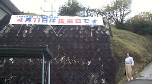 |  しかし、投票日を明日に控え、私たちは実家の父の見舞いのために、今夜のフェリーに乗って帰ることになりました。そこで、大分支所の側に出来ている不在者投票所で投票をすることになりました。大分支所の駐車場には大きな選挙の横断幕が出ています。 | |