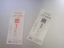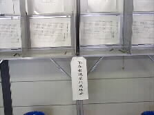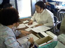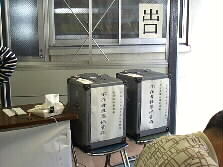 |    ここは受け付けです。ここで、明日どうして投票が出来ないのか、申し出て規定の用紙に署名します。そして投票用紙を受け取ります。投票用紙はこのような封筒に入っています。中には更に小さな封筒が入っていて、その中に投票用紙が入っているのです。赤い字の封筒が県会議員投票用、黒が県知事投票用です。 | |