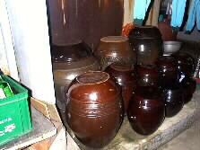 |  | 板戸を開けると、まず目に飛び込んできたのは、たくさんの甕です。これはキムチの甕です。何だか今夜の夕食が楽しみになってきました。 |