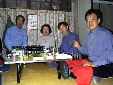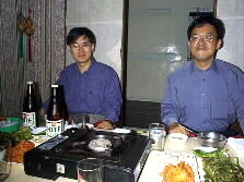 |    奥の大きな家に案内をしてもらって、お部屋に入りました。卓上コンロが運ばれてきて、たちまち、プルコギの準備が整いました。「疲れていませんか?」とずっと車で案内して下さった先生は私たちをねぎらって下さって、ビールを注いで下さいました。ビールはハイトビールというさっぱりとした味のビールでした。テーブルの上で黄色く見えるのがキムチです。鉄板で焼いたお肉にミソやごま油、プルコギソースをつけて、ちしゃで巻いて食べます。本場のキムチは風味があってとてもおいしく、お肉と一緒にたくさん食べました。 | |
