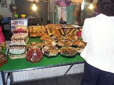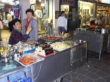 |  | 道路の真中に屋台が並んでいます。黒く見えるのは、太巻き、赤いのは勿論キムチ、そしてお鍋の中は、キムチおでんといいたいようなものがおいしそうにぐつぐつ煮えています。 |