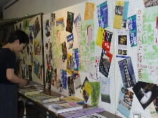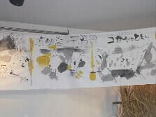 |    ロビーの壁には、今回の映画祭のポスターや各地の記録映画上映のチラシなどが張り出してありました。(左の写真)また、ゆふいんの皆さんが長い布に描かれた今回の映画のイメージ画がとても素敵でした。(右の写真) | |