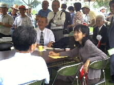|  | 熱戦の末、142手までで打ちかけとなりました。対戦者も大盤解説のテントに来られました。左から解説の西田さん、対戦者の阿部さん、そして穂坂さん、右端は大竹九段です。「今日はとてもいい対戦でした。まだこれは決着がついていません。この後を皆さんはどう打つか、是非、考えて下さい」と話されました。 |