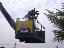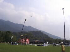 |    テレビカメラや取材のカメラマンは高さ40mのクレーン車の上から撮影をしています。取材記者は交代でこのゴンドラに乗ることが出来るとか、私も上って見たいなと思いました。ヘリコプターの取材も3―4機やってきて取材合戦も大変でした。 | |