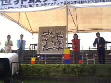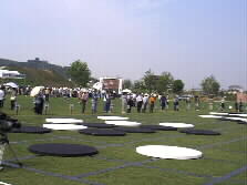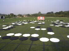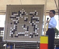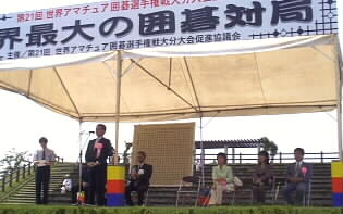 |  いよいよ、開会式です。第21回世界アマチュア囲碁選手権戦大分大会促進協議会会長の平松大分県知事に代わって、副会長の木下大分市長の挨拶のあと、大竹九段が今日の世界最大の囲碁対局についてお話をされました。ギネスにも載るかもしれない程のジャンボな碁盤は緑の芝生に40m四方で描かれています。碁石は直径1.8m厚さ4c重さ1kgの発砲スチロールで出来ています。 このテントの中で大盤解説がありますので、観客の皆さんは、テントの方を見たり、実際の大きな碁盤を見たりします。 | |