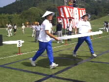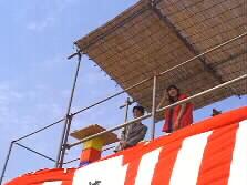 |    いよいよ対局が始まりました。対局者は高い櫓の上に立って、対戦をします。石の場所が決まると、大きな碁石を二人がかりで運びます。 運んでいるのは、大分上野が丘高校と大分工業高校の囲碁クラブの生徒さんたちです。囲碁の腕前も18級から6段までとなかなか頑張っている生徒さんたちです。 | |