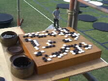 |    対局が終わって、人々が散り始めた頃、阿部五段が対局の為に上がっていた櫓に登ることが出来ました。櫓の上からの眺めは素晴らしいです。正面には、穂坂さんが登っていた櫓が見えます。下を見ると大きな碁盤が目の前に迫ってきます。側には、本物の碁盤が置かれていました。 私にはさっぱり試合運びの判らない囲碁ですが、今日の暑さは天気のせいばかりではない、集まった皆さんの熱気がそう感じさせたんだと思いました。やはり根強いファンの多い囲碁だなと思いました。明日は世界最長の囲碁大会が開かれるそうです。そちらも楽しみにしています。 | |