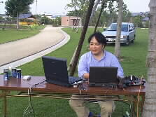 |  | 観戦者の輪から少し離れた所でパソコンを操っている人がいました。こんな所で、、、もしや?と思って近づいて見るとやっぱり、、、ハートの帆足さんが、インターネットライブ放送を流している所でした。暑い中、長時間お疲れ様でした。 |