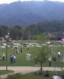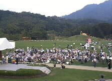 |   緑一杯の七瀬川自然公園には、たくさんの囲碁ファンが集まりました。左が大盤解説のテントです。後ろ中央と右端の赤く見えるのが対局者の登っている櫓です。その間にジャンボ碁盤、白と黒の大きな石が置かれているのが見えるでしょう? | |