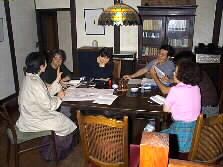|   | 「ことこと屋」ではグレゴリオチャントを聞きながら、実行委員長の加藤昌邦さんを中心に今年の音楽祭についての話し合いがすすめられました。旗揚げパーテイや当日の運営についての役割分担などの話し合いです。 私は今年も音楽祭ロビーのまとめ役をすることになりました。 運営委員会メンバーの(左から)加藤ご夫妻、ことこと屋の美佐子さん、会計の佐藤さん、観光総合事務所の井尾君、そしてMieです。(カメラは永野Ken) |