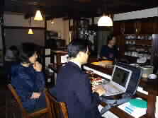 |  | ことこと屋のカウンター席では、会計の佐藤さんが、パソコンとにらめっこです。ゆふいん音楽祭実行委員会がこの夏にはNPOの申請をしたいということで、その準備で大忙しなのです。 |