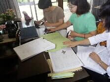 |  | 大分友の会員から集まってきた記録用紙をいろいろと責任者の安井さんが、点検をしてきましたが念のためもう一度皆で、目を通します。 |