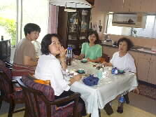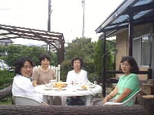 |    無事に集計が終わり、ほっとしました。夫がコーヒーを点ててねぎらってくれました。テラスでテイータイムです。左から安井さん、阿南さん、Mie、的場さんです。私が久しぶりに作った少し形の悪いシュークリームとコーヒー、疲れた身体においしかったです。 | |