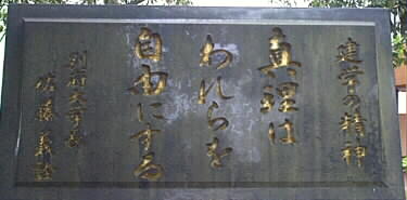 |  そこで、受け入れ先の別府大学付属高校に下見を兼ねてやってきました。校内に入るのは始めてです。玄関先の植え込みの中に「建学の精神」という石碑が立っていました。初代理事長の佐藤善詮氏が書かれた「真理はわれらを自由にする」という聖書から引用された言葉です。この言葉は息子の卒業した自由学園の思いと同じなので、またまた不思議な縁にびっくりをしました。 | |
