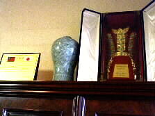 |  | 今日の記念写真です。右から田北先生、木許校長先生です。立派な書は、文化交流で昌信高校の生徒の書いたものだそうです。 後の棚には、別府大学付属高校の輝かしい記録の数々が収められていました。 明治41年私立豊州女学校を前身とする歴史の長い高校です。 今から20日にやってくる、生徒さんたちと会うのがとても楽しみです。 |