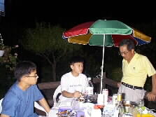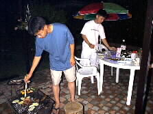 After we arrived home and refreshing by shower, we started a barbecue party. They helped us by making a stove fire. |