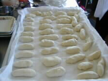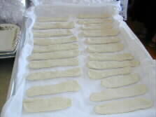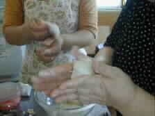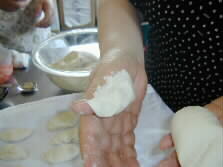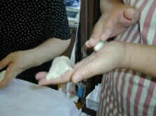 The fragment is then rolled into smaller conical dough on the palm (left.) The conical dough is laid down on a wet dishcloth neatly. Another wet dishcloth covers the row of dough for further ten minutes maturing.