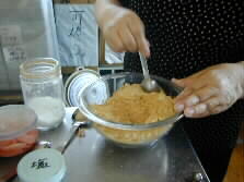 During the ripening, soybean flour is prepared. The amount of sugar depends upon preferences, but I put the same amount of sugar as the soybean flour this time and a pinch of salt. The fragrance of the mixture filled the room.