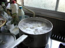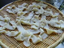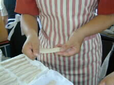 The ripened dough is again rolled out a little thin and longer, and again ripened another ten minutes. Plenty of boiling water will be prepared during the process.