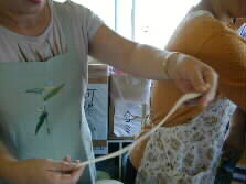 Now the dough will be stretched. Grasp the both ends of the dough and pull it at a time. The dough gets longer surprisingly. When we make Dango-soup, another special product of Oita, the elongated dough is cut apart longitudinally to make the noodle. The dough is then boiled. Today, as we prepare for Yaseuma, the dough is not elongated so long, about 30 centimeters or so.
