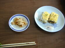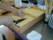 Ohmura sushi is a kind of "pressed-sushi", which is shaped in a big wooden frame like this (left) that serves for 12 dishes. Fried egg is finely sliced into thin threads and plentifully topped on the sushi. Additional green buds of a fragrant tree were put on it as a decoration. The sushi contains unusual ingredients such as sliced burdock, fine strips of radish, and salmon flakes. On the small dish in the right picture is Yaseuma, a special product of Oita. Why is it called "Yaseuma", or "thin horse?" An old tale says: "In a feudal premise, a baby of the lord felt hungry and asked the baby sitter nicknamed "thin" to prepare something to eat, saying "Uma, uma." The word "uma" means "food" in baby talk, and the pronunciation of "uma" is the same as "horse" in Japanese.