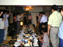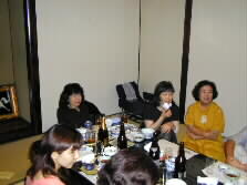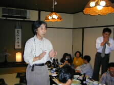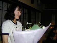 |  | 今夜はもう一つ、うれしい乾杯です。私たちの若い仲間のゆうこさんが、つい先日、ご結婚をなさったのです。皆からお祝いの気持ちを込めて大きな花束をプレゼント。 素敵な家庭を作って下さいね。 |