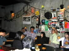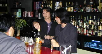 |  音楽祭のパーテイーの二次会でよく来るお店です。一緒に打ち上げパーテイーに出席していた大谷さんと友人の恵太君がカウンターに入って早速飲み物の注文を聞いています。 後ろの棚にズラッと並んだ洋酒のビン、何種類位あるの?と聞いたけれど、「僕にも分からない」と大谷さん、(写真右) | |