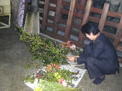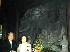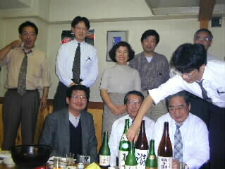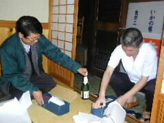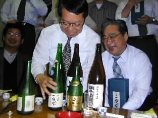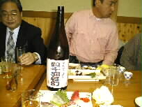 |  最後にみんなで記念写真です。まずは今日のお酒を並べて、、、と本当にうれしそうなお顔ですね。右から木津さん、友田さん、田中さん。お酒は、、右から木津さんのおみやげの「一夜雫」の箱、千羽鶴(生吟醸・大分県久住町佐藤酒造)手前金ラベルは千羽鶴大吟醸(同じく)その後ろは義侠游(吟醸・愛知県海部郡・山忠本家)一夜雫(大吟醸・北海道旭川市小桧山酒造)その後ろは東一(吟醸・佐賀県藤津郡五町田酒造) | |