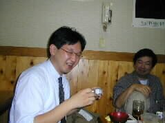 | 今日のお酒は、コアラの電子会議室「居酒屋」で友田さんたちが選んだお酒を、「田染荘」(酒屋)の津田さんが運び込みました。そしてそのままオフ会にも参加してしまいました。お酒談義に忙しい津田さんです。 |  |