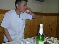 |    何だか、皆さんおいしいお酒の取り合いっこといった観ですね。左から大嶋さん、佐々木さん、松村さん、田中さんです。右の写真は「はしもと」のマスターです。味にはとっても厳しい方です。一夜雫を飲んでいます。さて感想は?「ウン、これはやはり北のお酒だ、淡麗だ」 | |