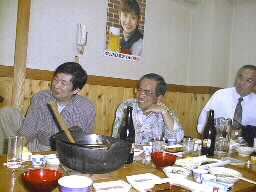 |  | おいしいお酒、おいしい肴、「はしもと」特性のチャンコ鍋も出てきて、ますます座が賑わっています。 右から江藤さん、永野Ken、結城さんです。 |