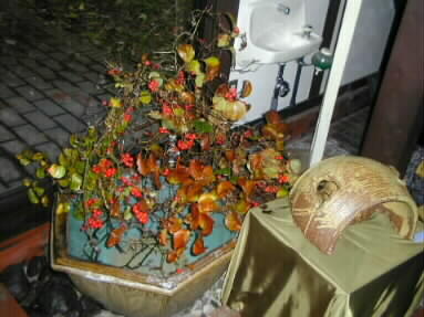 ![]() 次に、陶芸展「白い器など」を見るために「ことこと屋」にやってきました。そうしたら、なんと、今日は臨時休業でした。でも、ご主人の莞爾さんや美砂子さんが、にこにこと迎えて下さって、まあどうぞ、見て行って下さいとお店に入れて下さった。さっき、莞爾さんが山から切ってきたという山帰来の見事な枝が水盤に生けてありました。日出に工房のある坂本未刀さんの器や花入れはとてもしっとりとしていい作品ばかりでした。